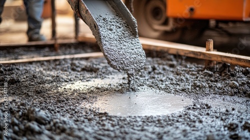 Concrete mixer pouring cement into reinforced base as part of modern urban construction project