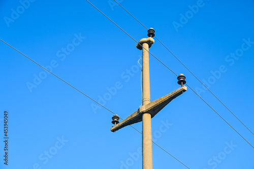 Concrete pillar with electricity cables hanging on. Electric utility pole with power lines. High voltage electric power line against the blue sky.