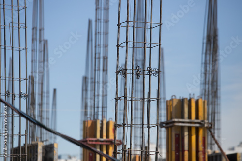 Concrete pillars on construction site. Building of skyscraper with crane, tools and reinforced steel bars.