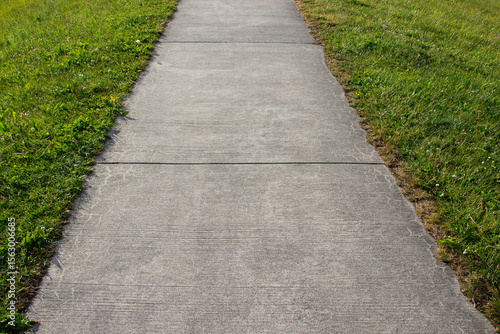Concrete walkway bordered by green lawn on both sides on a sunny day. Clean modern garden path, urban or suburban landscaping.