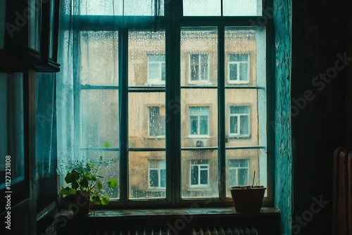 Condensation Drops Obscuring Window of Cozy Household Interior