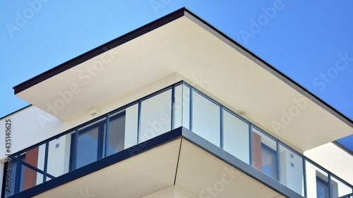 Condominium and apartment building with symmetrical modern architecture in the city downtown.