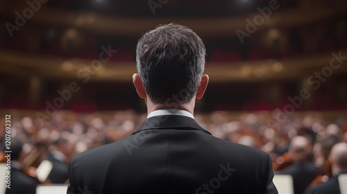 Conductor leading symphony performance concert hall music event elegant setting rear view artistic expression