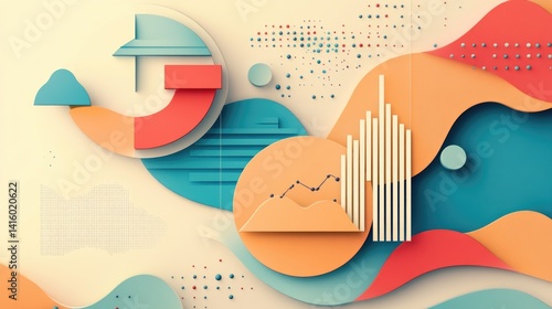 Conference-style materials arranged on a background of color gradients and abstract shapes