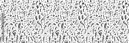 Confetti doodle party seamless pattern. Happy birthday celebration. Fun vector texture carnival background. Hand-drawn sketch festive ribbon elements. Kids Christmas doodle exploding party popper bg