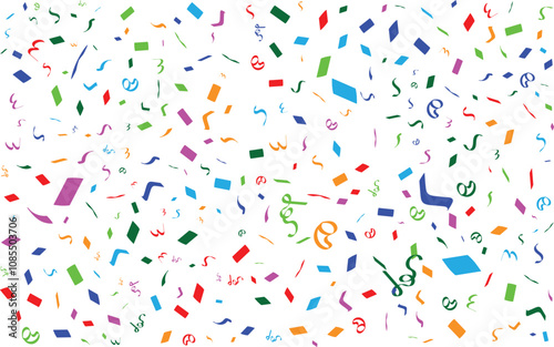 Confetti falling background. Birthday, weeding anniversary, Party, event, festive firework. Multicolored Carnival confetti on white background.
