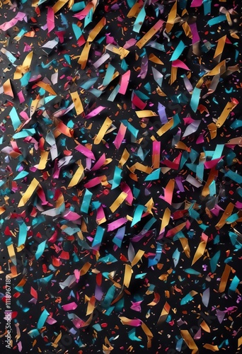 Confetti flying in a zigzag pattern with metallic colors, colorful chaos, celebratory scene