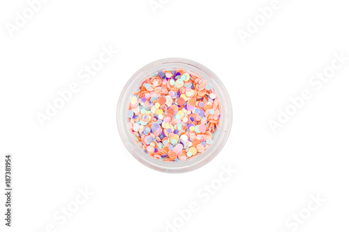 Confetti for manicure. Round beautiful sequins for nail design in manicure and pedicure. Decorative particles. Fish scales for decoration. Pink, purple, coral, blue in a small glass jar.