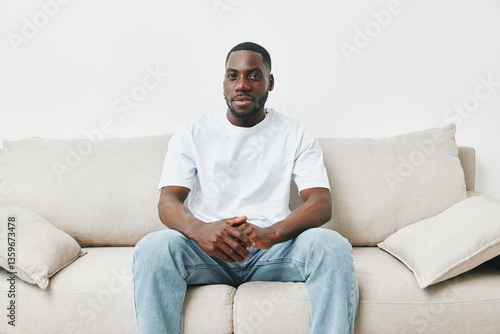 Confident African American man sitting on a light colored couch, wearing a simple white t shirt and jeans, reflecting casual style and relaxation
