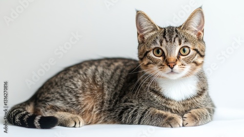 Confident American Bobtail Cat Sitting on White Background, Short Tail, Muscular Build