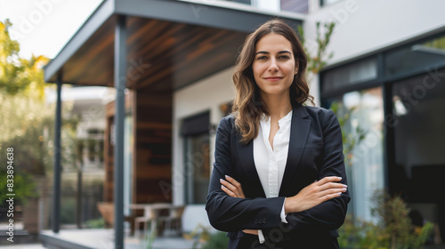 Confident American woman real estate agent stands proudly outside a modern home, radiating expertise and approachability, ready to assist potential house buyers