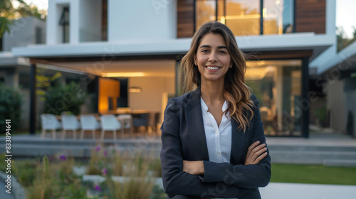 Confident American woman real estate agent stands proudly outside a modern home, radiating expertise and approachability, ready to assist potential house buyers
