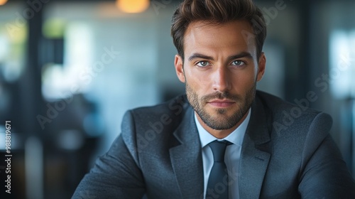 confident and focused young businessman sitting at desk in modern office, serious about career and business strategy in a corporate environment showcasing leadership skills and work productivity