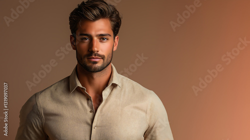 confident and handsome man against clean mocha mousse background, generative ai