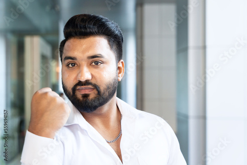 Confident and successful Indian business man or office worker getting job promotion and a raise