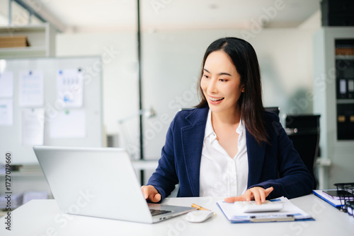Confident Asian businesswoman using calculator and laptop while smiling in office.