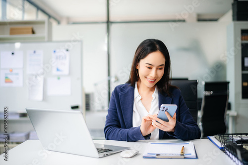 Confident Asian businesswoman writing on clipboard, smiling while working at desk with laptop and documents.