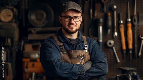 Confident auto mechanic posing with an array of tools. Professional setting against a neutral background.