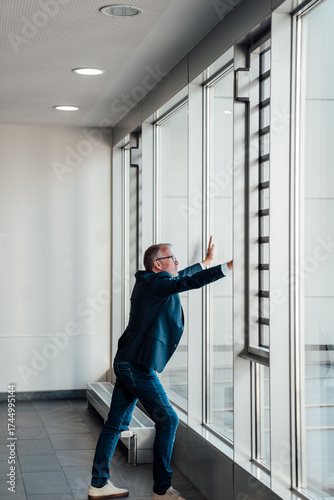 Confident bestager businessman with foresight looking out office window