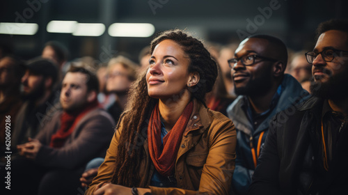 Confident Black Woman: Attentively Seated and Engaged in a Conference, Embracing Knowledge and Empowerment