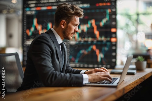 Confident business professional analyses complex financial charts on a laptop in a cafe setting