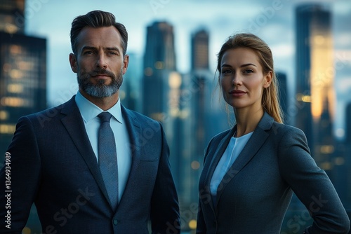 Confident business professionals stand against a cityscape backdrop, showcasing success and ambition.