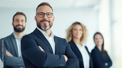 Confident business team standing together in modern office environment, showcasing professionalism and unity.