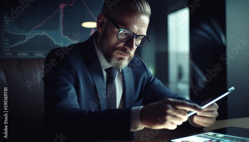 Confident businessman analyzing chart on mobile phone generated by AI