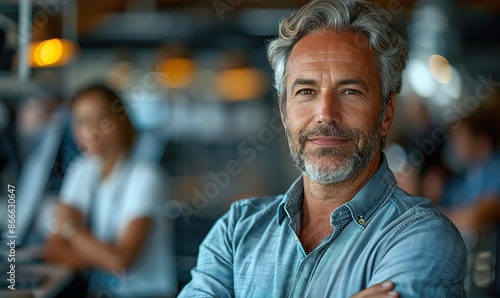 Confident businessman and coworker in office, exuding success and leadership.