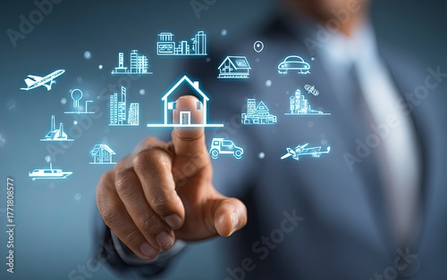 Confident businessman expertly navigates smart home technology on a futuristic virtual screen, embracing innovation and modern living for seamless control and a connected future.