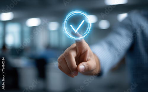 Confident businessman hand touching glowing checkmark icon for quality standard approval. positive symbol of assurance, success, and digital technology guarantee