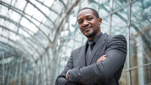 Confident businessman in a suit stands with arms crossed inside a modern glass building.