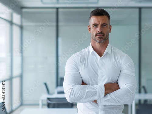 Confident businessman in a white shirt standing in a modern office, showcasing leadership and professionalism.