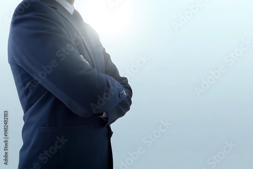 Confident Businessman in Blue Suit with Arms Crossed Standing Against a Light Blue Background