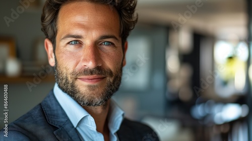 Confident Businessman in Blue Suit with Beard and Bright Eyes in Modern Office Setting for Professional Corporate Stock Image