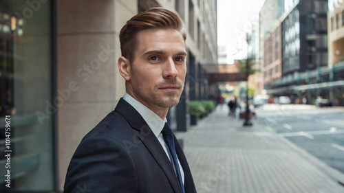Confident Businessman in City: Portrait of a determined businessman in a sharp suit, looking towards the future in a bustling cityscape. men's health concept
