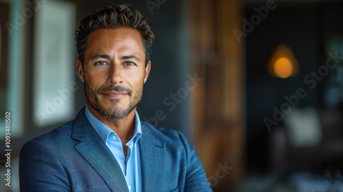 Confident businessman in elegant suit standing with his arms crossed for portrait photography, and looking at camera.