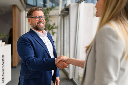 Confident businessman in eyeglasses shaking hands with businesswoman while sealing successful agreement in office