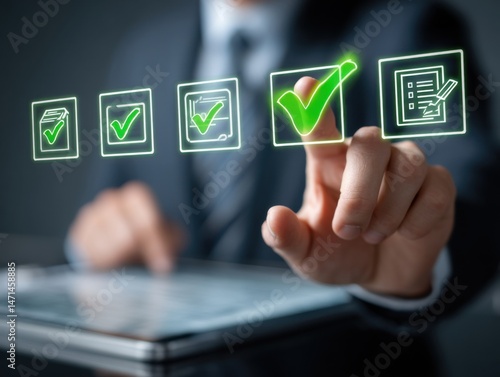 Confident Businessman in Formal Suit Pressing Green Checkmark Symbolizing Success Achievement and Positive Decision Making in Corporate Environment