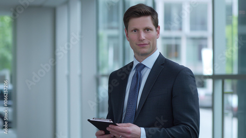 Confident businessman in modern office holding notepad with financial tips, exuding success and prosperity in professional environment.