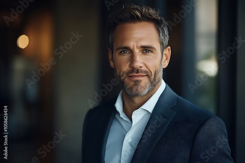 Confident Businessman in Navy Blue Suit Headshot