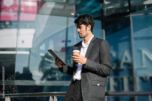Confident Businessman in Suit Holding Tablet and Coffee Outdoors Urban Professional Work