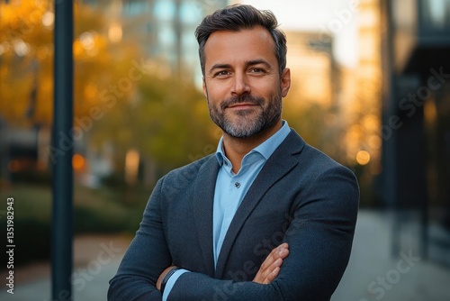 Confident businessman in suit standing outdoors with arms crossed smiling in modern urban setting representing professionalism and success
