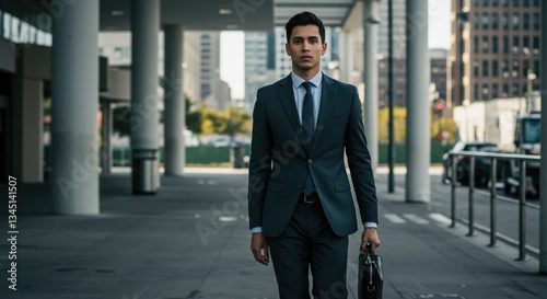 Confident Businessman in Suit Walking Downtown with Briefcase, Ideal for Professional and Corporate Themes
