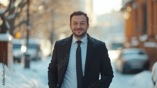 Confident Businessman in Winter Attire Smiling in Urban Snowy Environment with Space for Text