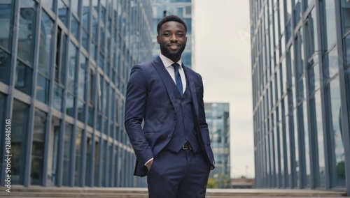 Confident businessman outdoors between modern buildings