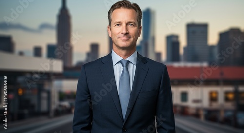 Confident Businessman Portrait Professional Headshot Against City Skyline, Corporate Executive, Leadership, Success