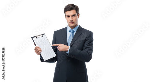 Confident businessman presents a document on a clipboard, highlighting key points with a focused gaze on a dark backdrop.