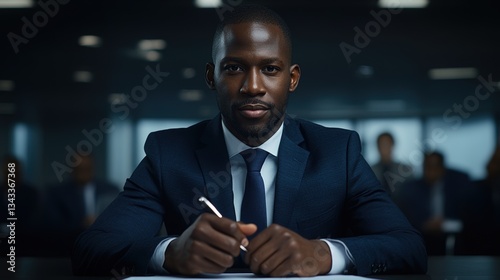 Confident Businessman Sitting at Desk with Pen in Hand in Modern Office Environment