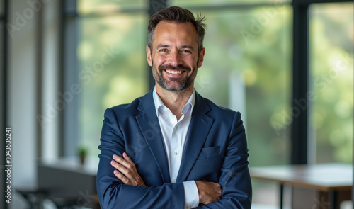 Confident businessman smiling with arms crossed in modern office.